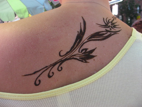 This past weekend, we decided to partake of public transportation and head south to Berkeley, thus checking off yet another thing on the "Aubrey Farewell-Tour To-Do List." (CHECK!) Leslie, Cameron and I went and met Dan & Leah for Thai Temple brunch (SO much food for $4) and then the (un)diligent amongst us that didn’t go off to work (read: Me – obvi, Cam and Leah) trolled around the streets of Berkeley for a little shopping and funning and sunning. (And deuce-deuce drinking, natch.) Since I’m totally aversive to tattoos (too fickle) but in an edgy mood as of late, we decided to hit up the henna lady on the corner for some hipster henna action. I got a badass one on my upper back and Cameron opted for a hott "sleeve" that ended up turning out awesomely. (Not to be left out, Leah got one on her hand, but I don’t have a pic for some reason.)