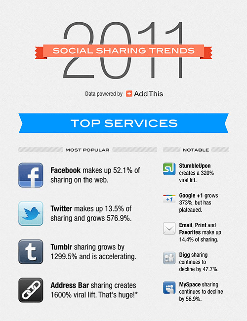 Neat! AddThis just published their 2011 stats on “sharing” across the web.